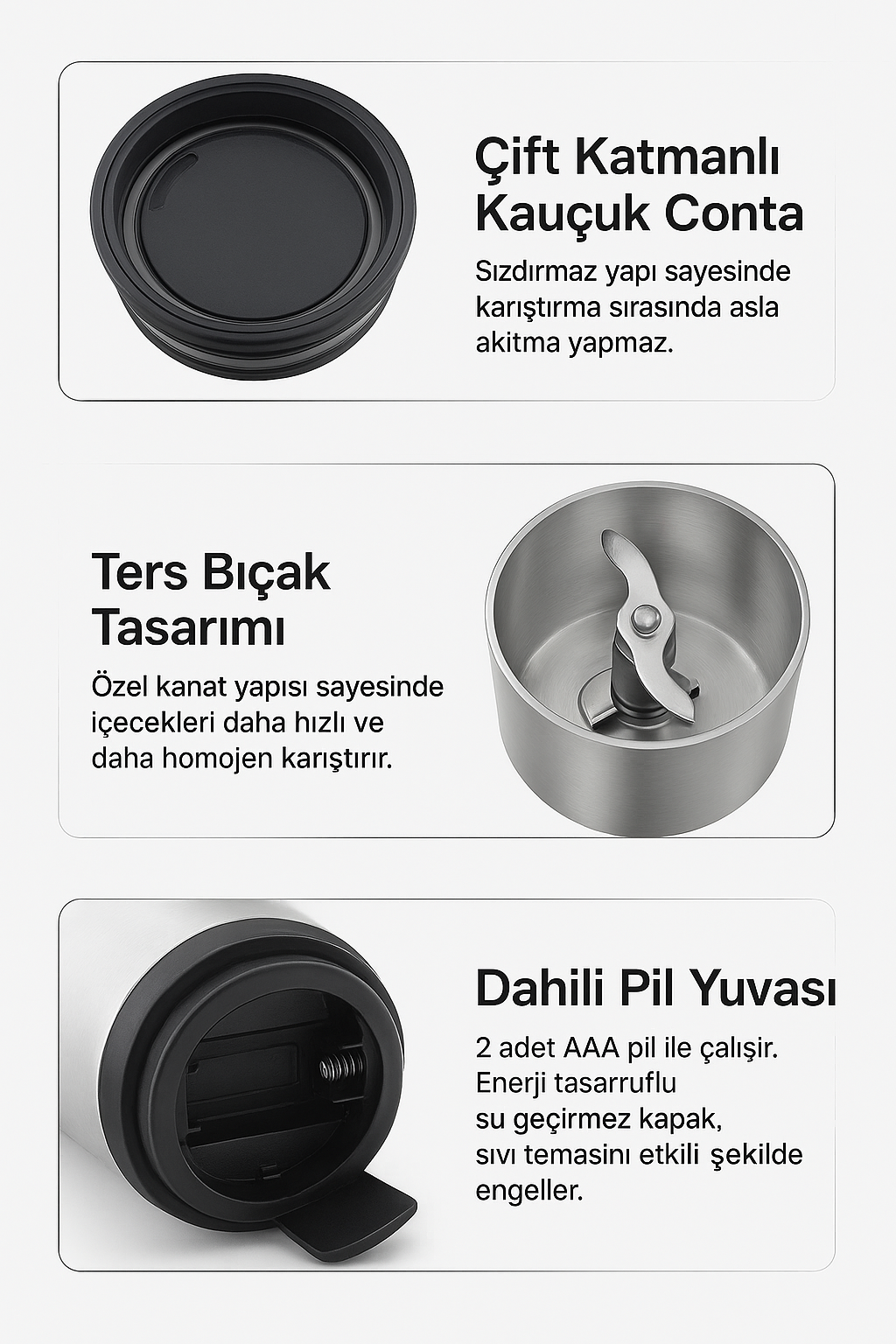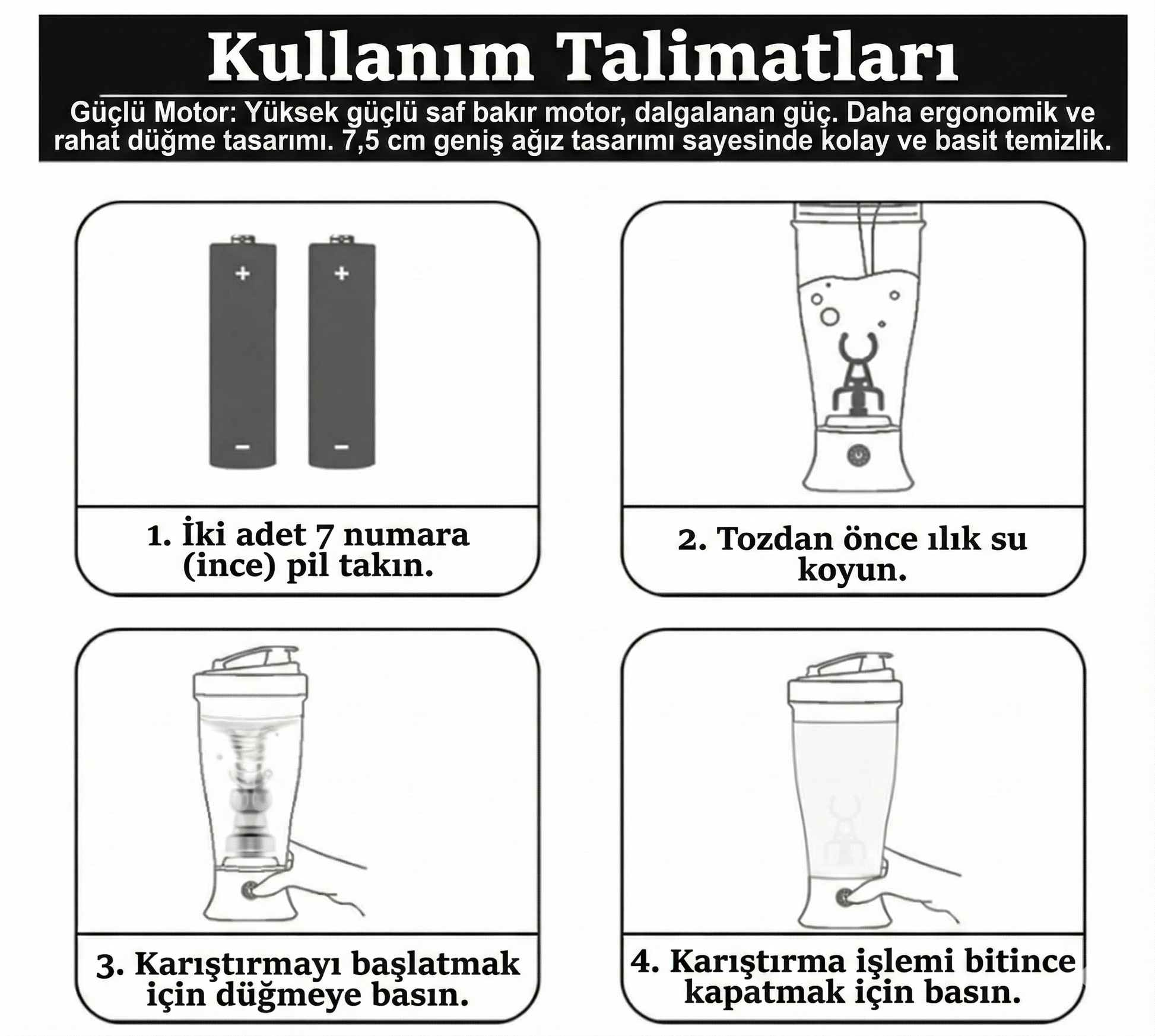Karıştırıcı kap 2 adet AAA pil ile çalışır.